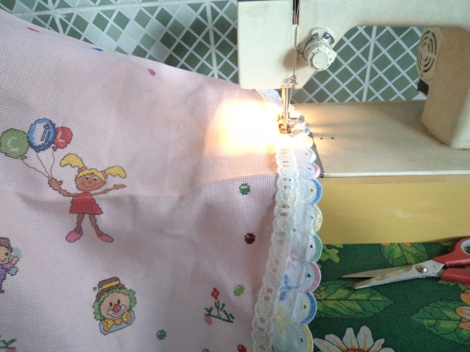 E POR FALAR EM ABACAXIS E PEPINOS...RSRSRSR, A MINHA FILHA DE 15 ANOS ESTÁ GRÁVIDA, ESTÁ COLOCANDO EM PRÁTICA O PROJETO DELA...QUE PROJETO! E PORTANTO, EM QUESTÃO DE DIAS ELA E A FILHA MAIS VELHA APRENDERAM A BORDAR NA INTERNET E ESTÃO FAZENDO UNS BORDADINHOS BEM LINDINHOS...ENTRETANTO, ELAS NÃO SABIAM COSTURAR À MÁQUINA...E A PRIMEIRA COSTURA FOI ESSA, ME DERAM ESSE DIREITO DE COSTURAR ESSA PEÇA DO ENXOVAL DA CRIANÇA...DEPOIS, COMEÇARAM A PEGAR NA MINHA MÁQUINA DE COSTURA ESCONDIDO E A CABEÇA DESTA FAÇANHA É A FILHA MAIS VELHA, JÁ FEZ ATÉ UMA BOLSA LINDA PARA ELA , QUERO FOTOGRAFAR, MAS ESTÁ ESCONDIDA...EU NÃO QUERIA QUE FOSSE ASSIM, GOSTARIA QUE FOSSE TUDO ÀS CLARAS, POXA VIDA...
